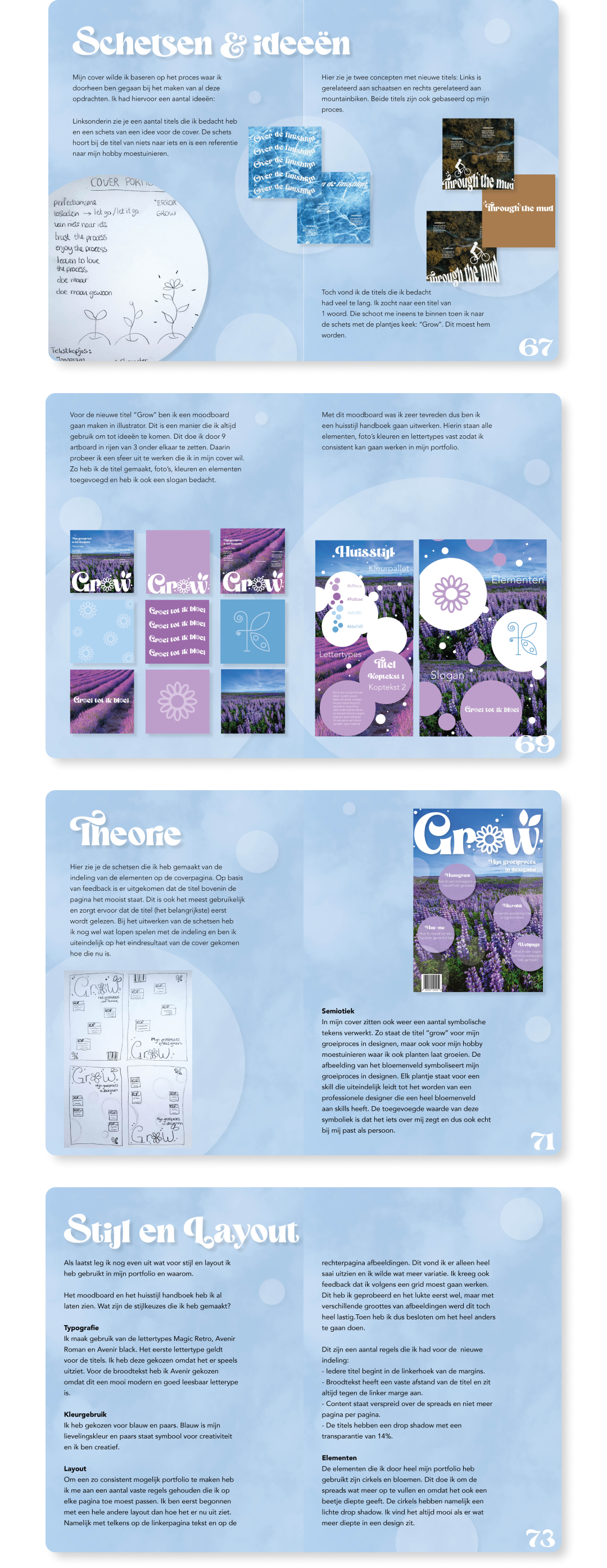 GROW is een portfolio die ik gemaakt heb in de eerste periode van mijn studie Communicatie & Multimedia Design. De naam staat voor het begin van mijn groei als ontwerper. Met deze opdracht is het eerste zaadje geplant van de zoektocht naar mijn eigen stijl. Het bevat een kleine collectie van ontwerp opdrachten: een monogram, character, webpage en een tijdschrift cover pagina die ontworpen zijn om mij als persoon weer te geven. Ik heb op dit portfolio een 10 gekregen!